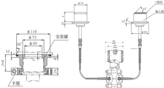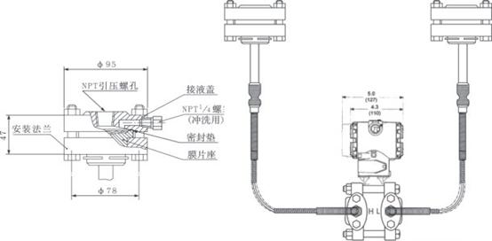 AK-3051DP雙法蘭液位變送器是一種通過安裝在管道或容器上的遠傳裝置來感受被測壓力,該壓力經毛細管內的灌充硅油(或其它的液體)傳遞至變送器的主體,然后由變送器主體內的δ室和放大線路板,將壓力或差壓轉換4~20mA.DC信號輸出(參見結構原理圖)。 |