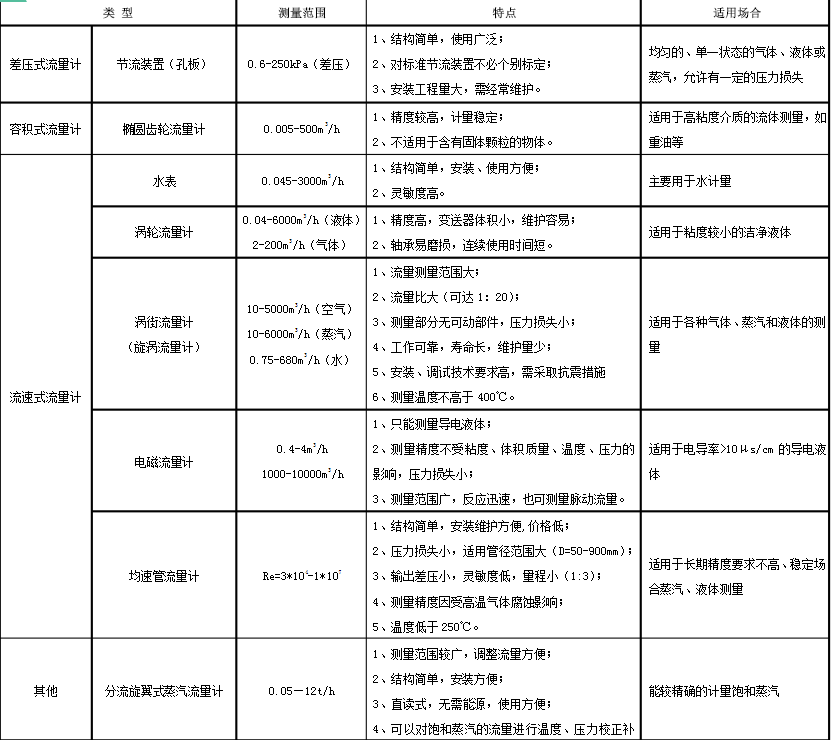 從上述表中,我們可以看出,適用于蒸汽流量測(cè)量的只有4種,即節(jié)流裝置(孔板)、渦街流量計(jì)(旋渦流量計(jì))、均速管流量計(jì)、分流旋翼式蒸汽流量計(jì)。?
